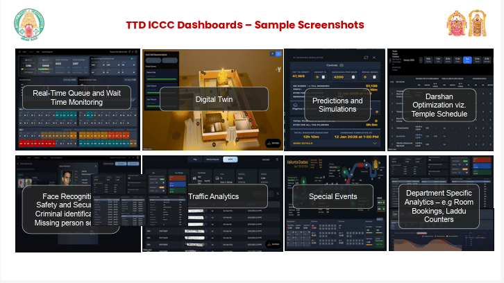 The Integrated Command Control Center (ICCC) brings together the majority of its functions like pilgrim management, prasadam distribution, temple schedule management and traffic management.