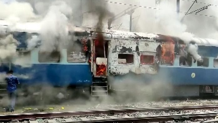 Baton-wielding protestors smashed glass windows of the intercity express train at Bhabhua Road railway station and set one coach on fire. Holding a banner saying “Indian Army lovers”, they raised slogans rejecting the new recruitment scheme.