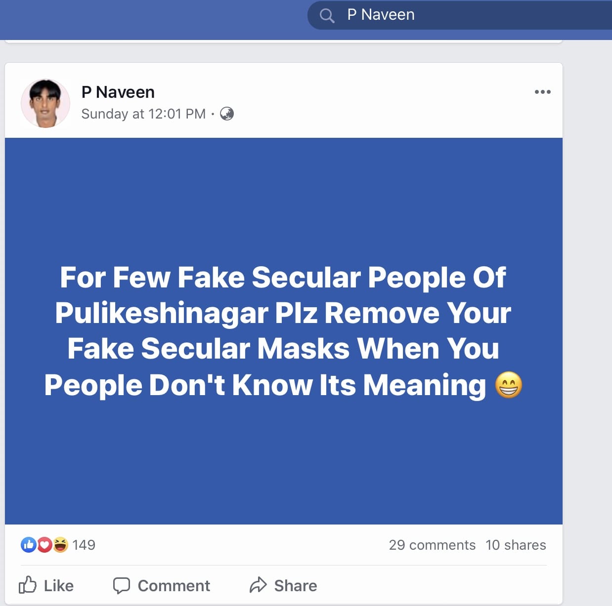 Apart from the post that sparked the riots, there is also one attacking “fake secular people”. “For a few fake secular people of Pulakeshinagar pls remove your fake secular masks when you don’t know its meaning,” it read.