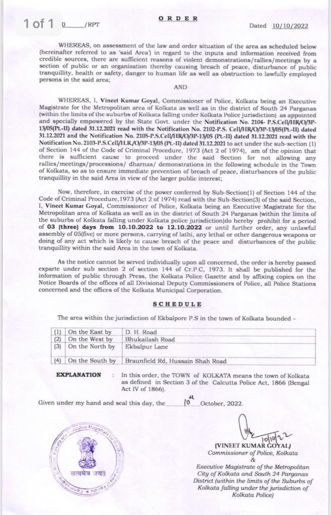 Kolkata (West Bengal) [India], October 10 (ANI): The West Bengal Police on Monday imposed section 144 in the Ekbalpur area of the state for two days.