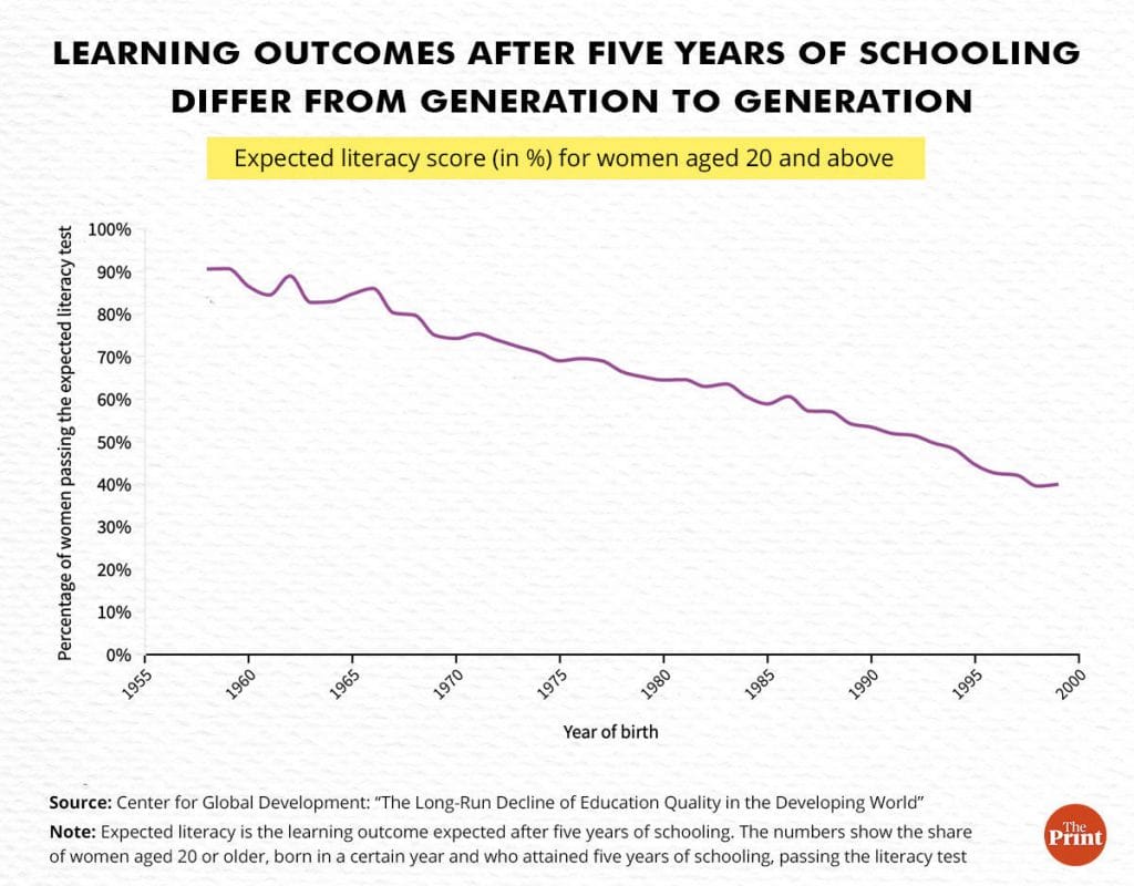 “Taken at face value, the estimates for India suggest the probability a woman with five years of schooling would become literate was nearly 100 percent for the 1960s birth cohorts, but had fallen to roughly 40 per cent for the mid-1990s cohorts,” the study said.