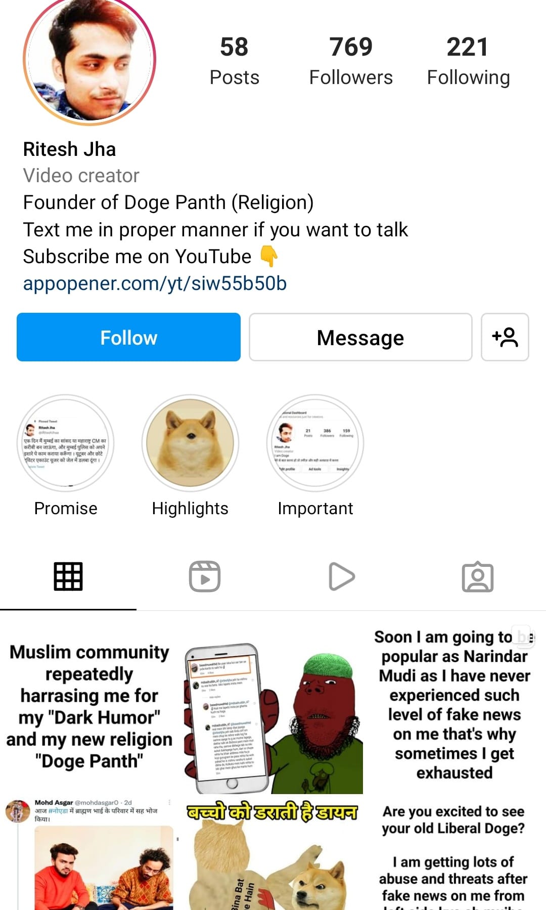 Jha’s Instagram account is filled with sexist and Islamophobic content. On his now-deleted Twitter account, his bio said ‘Internet Celebrity and Nightmare for Leftards’. He recently posted ‘#ReleaseYatiNarshinganadji’, in support of the controversial mahamandaleshwar of the influential Juna akhara (monastic order).