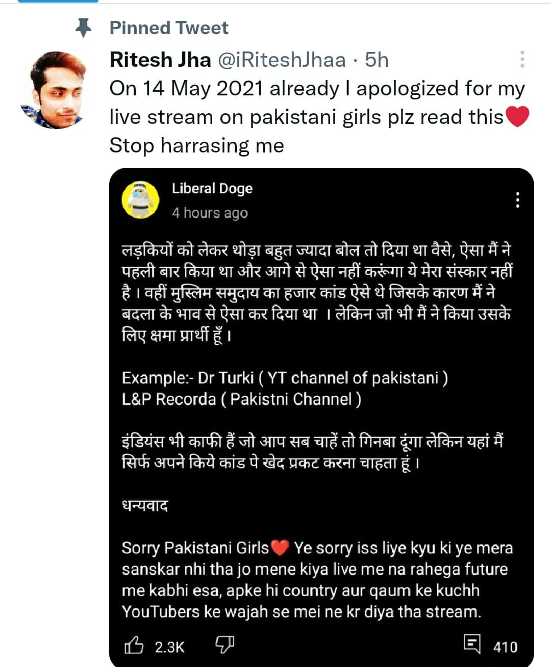 Ritesh Jha wasn’t active on social media for a couple of months after the uproar over the livestream, but made a comeback in December on YouTube, Twitter and Instagram. This week, he purportedly made a “comeback” video — “I am back #@$& (abuse)” – on a YouTube channel called ‘Liberal Doge’. The channel has now been taken down.
