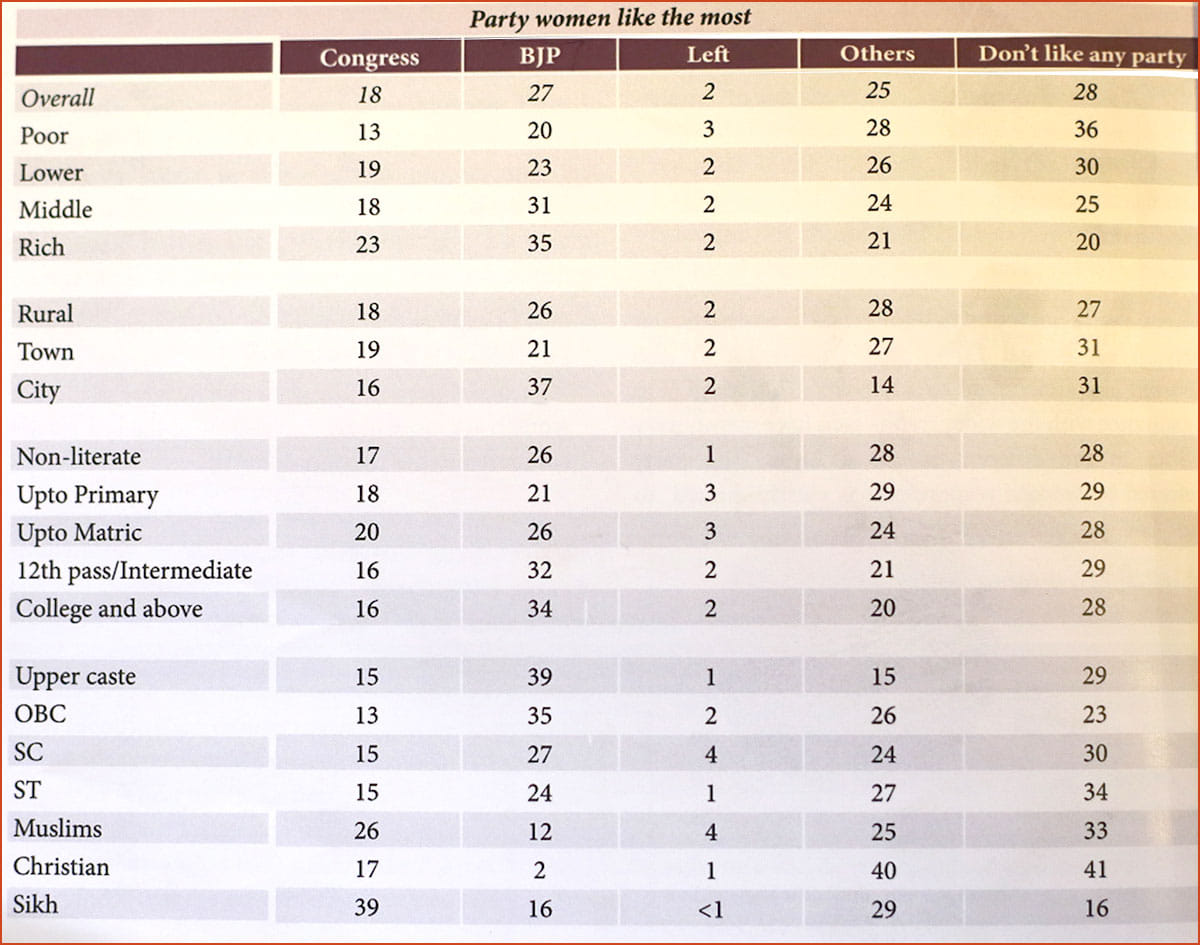 The study also notes age-wise preferences of political parties and notes that BJP is most-liked by younger women. Close to one-third or 32 per cent of young women respondents (between 18-20 years age) like BJP the most, as opposed to 13 per cent of this age group preferring the Congress.