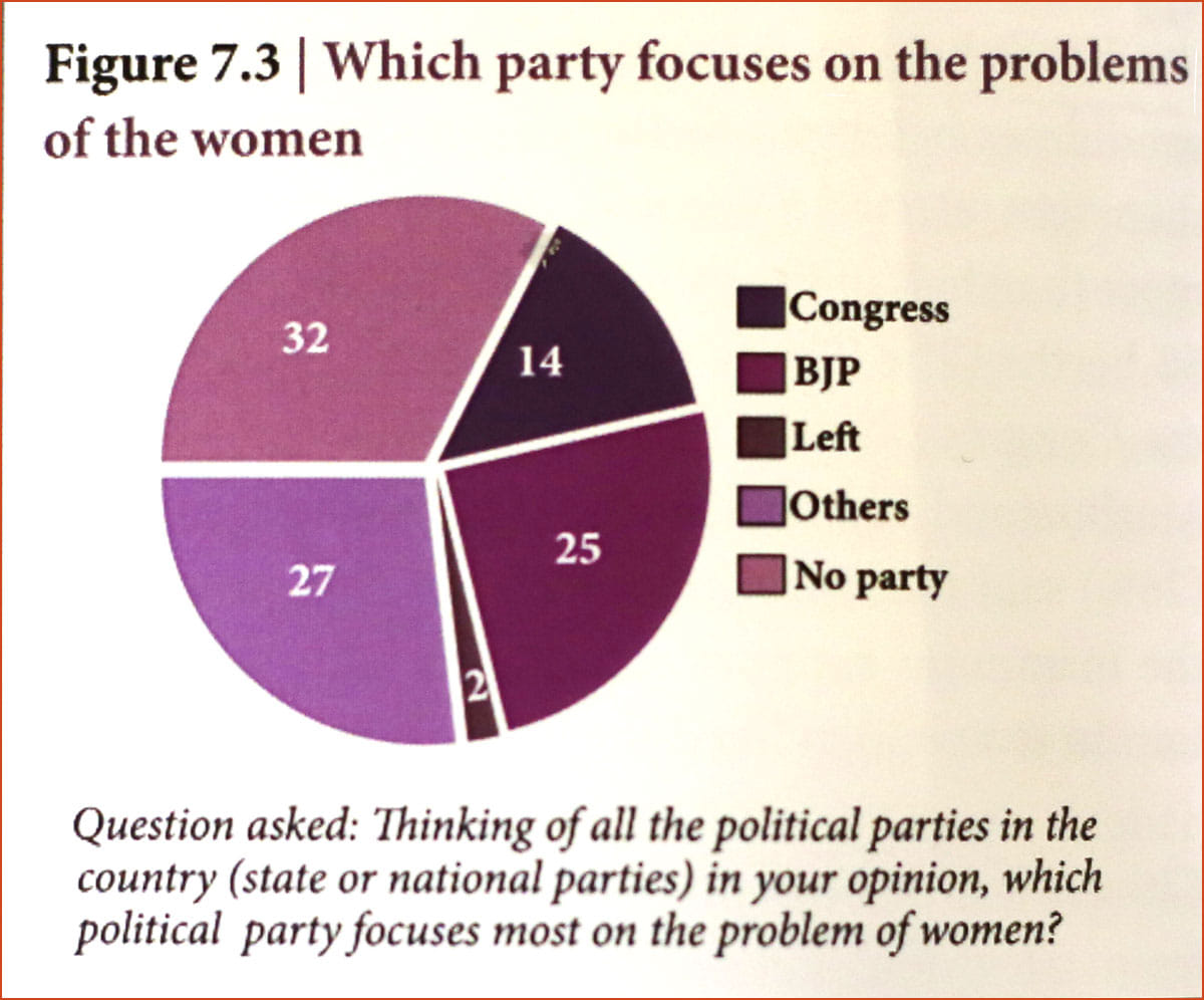 The study says that a 25 per cent of women believes it is the BJP which focuses most on problems concerning women while only a 14 per cent vouched for the Congress.