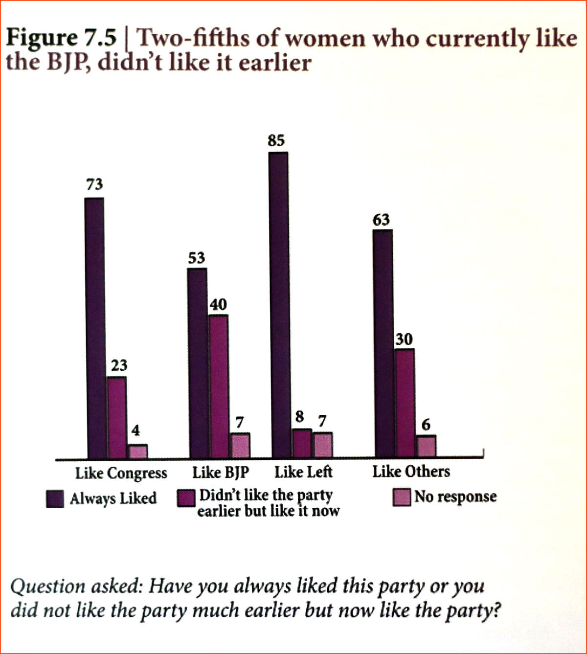 The report, however, points out that two-fifth of this support for the BJP is only recent (figure 7.5). A 40 per cent of women BJP supporters also said they didn’t always prefer the party and have only recently taken a liking to it.