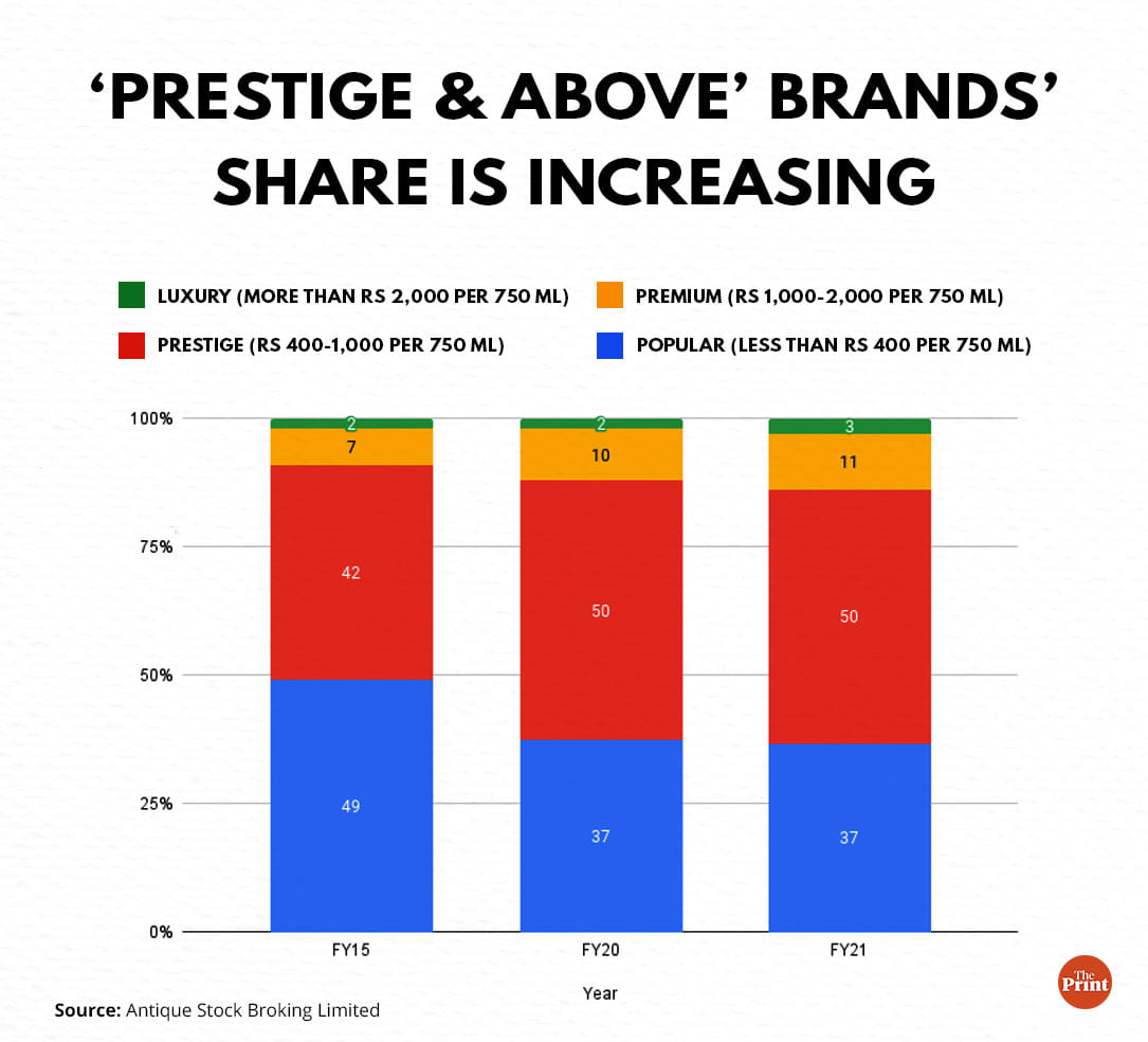 Premium and luxury brands are spirits that cost more than Rs 1,000 and Rs 2,000 per 750 ml, respectively. Popular brands — those priced at less than Rs 400 per 750 ml — have seen their share fall significantly over 2014-2021.
