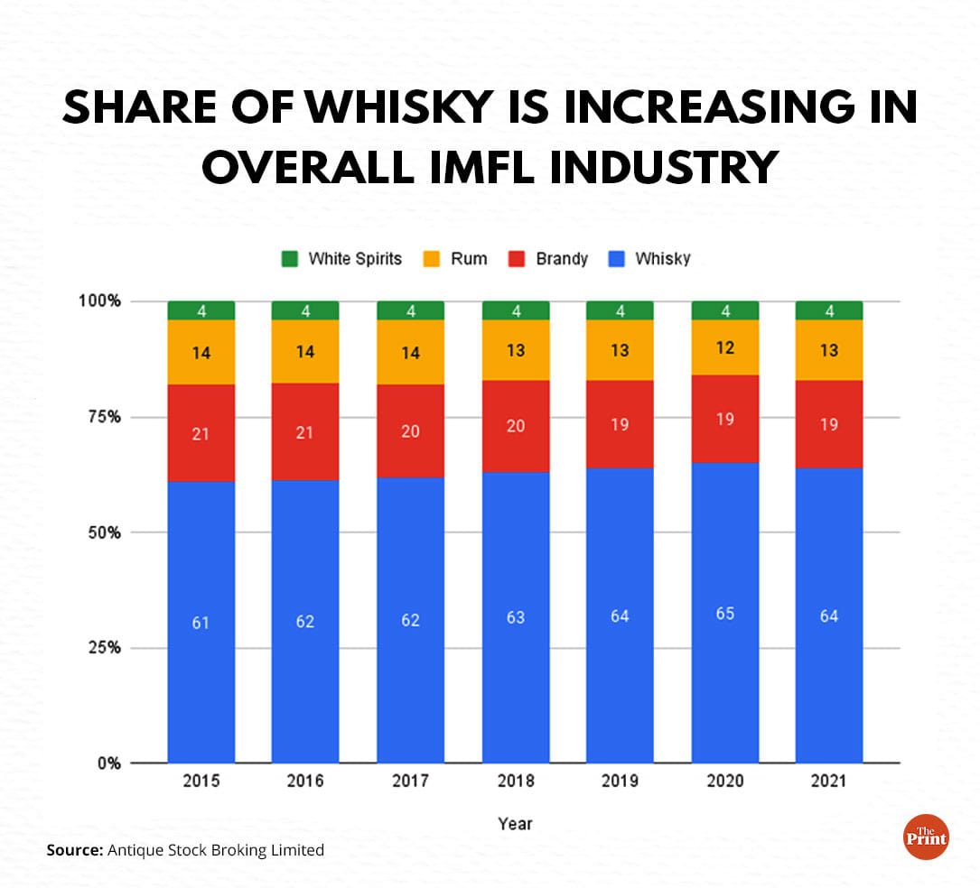 “Indian IMFL is largely dominated by brown spirits contributing more than 96 per cent of the volume,” the report said. “In overall spirits, whisky contributed 64 per cent of the total IMFL volume in 2021. The contribution of whisky has increased from 59.5 per cent in 2014 driven by volume growth of 1 per cent CAGR (compound annual growth rate) over 2014-2021 versus no growth in industry volume.”