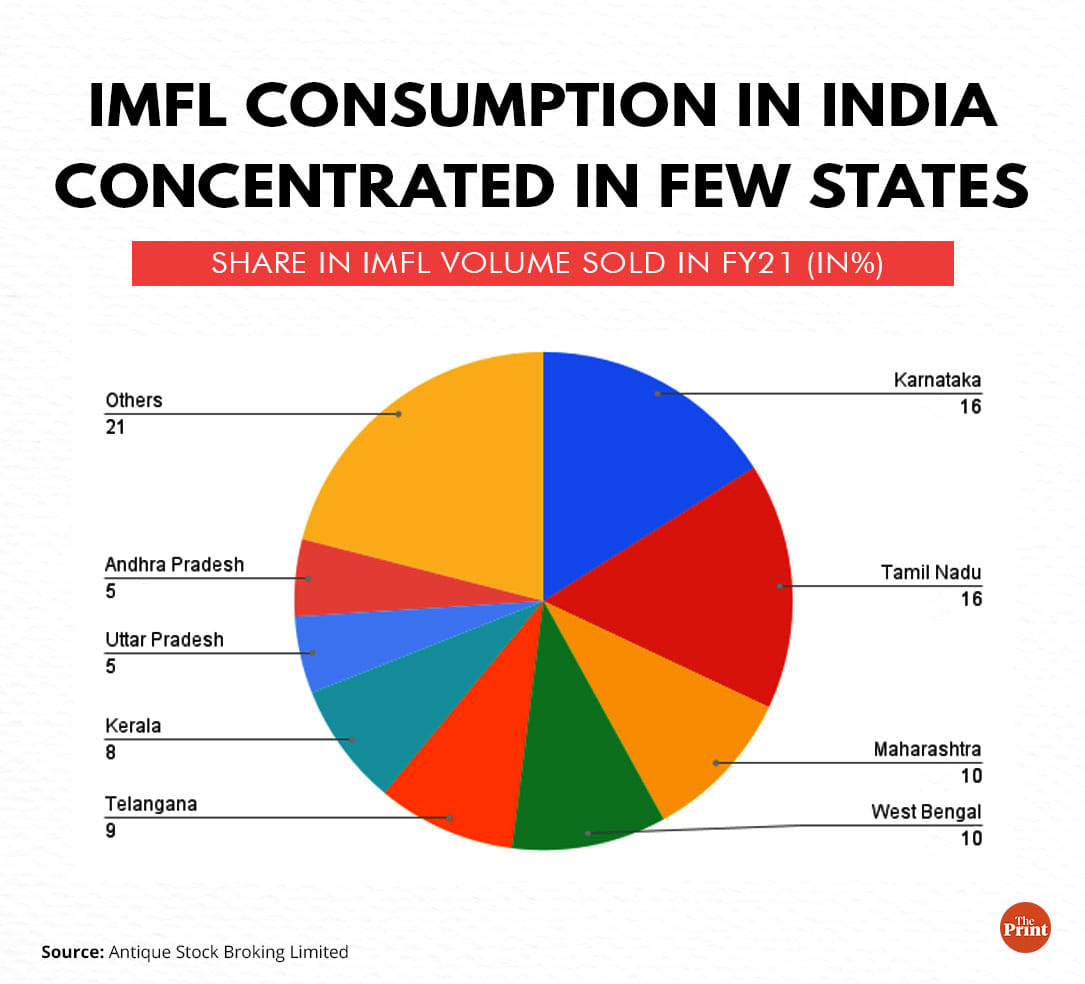 The report on the alcoholic beverage industry by Mumbai-based financial services conglomerate Antique Stock Broking, released Monday and reviewed by ThePrint, found that spirits make up 93 per cent of alcohol consumption in India — far higher than in peer countries such as China (69 per cent), Brazil (36 per cent), the US (33 per cent), the UK (22 per cent), and South Africa (17 per cent).