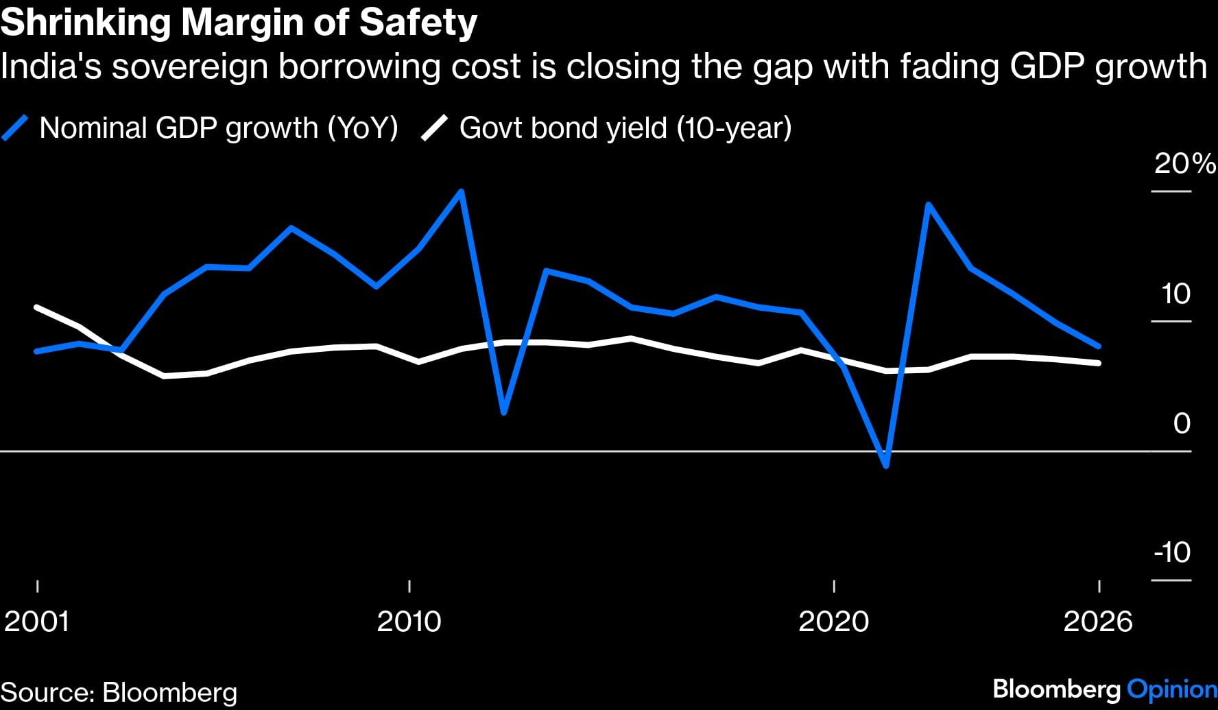 Public debt — including that of the 28 Indian states — has hovered between 80% and 85% of GDP in recent years. But funding sources are constrained. If New Delhi doesn’t keep a tight lid on its own obligations, it will be forced to raise funds from a limited pool of creditors at a cost higher than what can stabilize the debt. With 10-year sovereign bond yields inching up to 6.7%, and nominal GDP slowing to 8%, the margin of safety demanded by bond investors is narrowing.