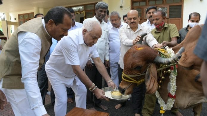Flanked by his cabinet colleagues, including Animal Husbandry Minister Prabhu Chauhan and Home Minister Basavaraj Bommai, the CM put vermilion and turmeric powder on the forehead of the ‘Go Mata’ and showered ‘Akshat’ and flowers on them, at his residence here.