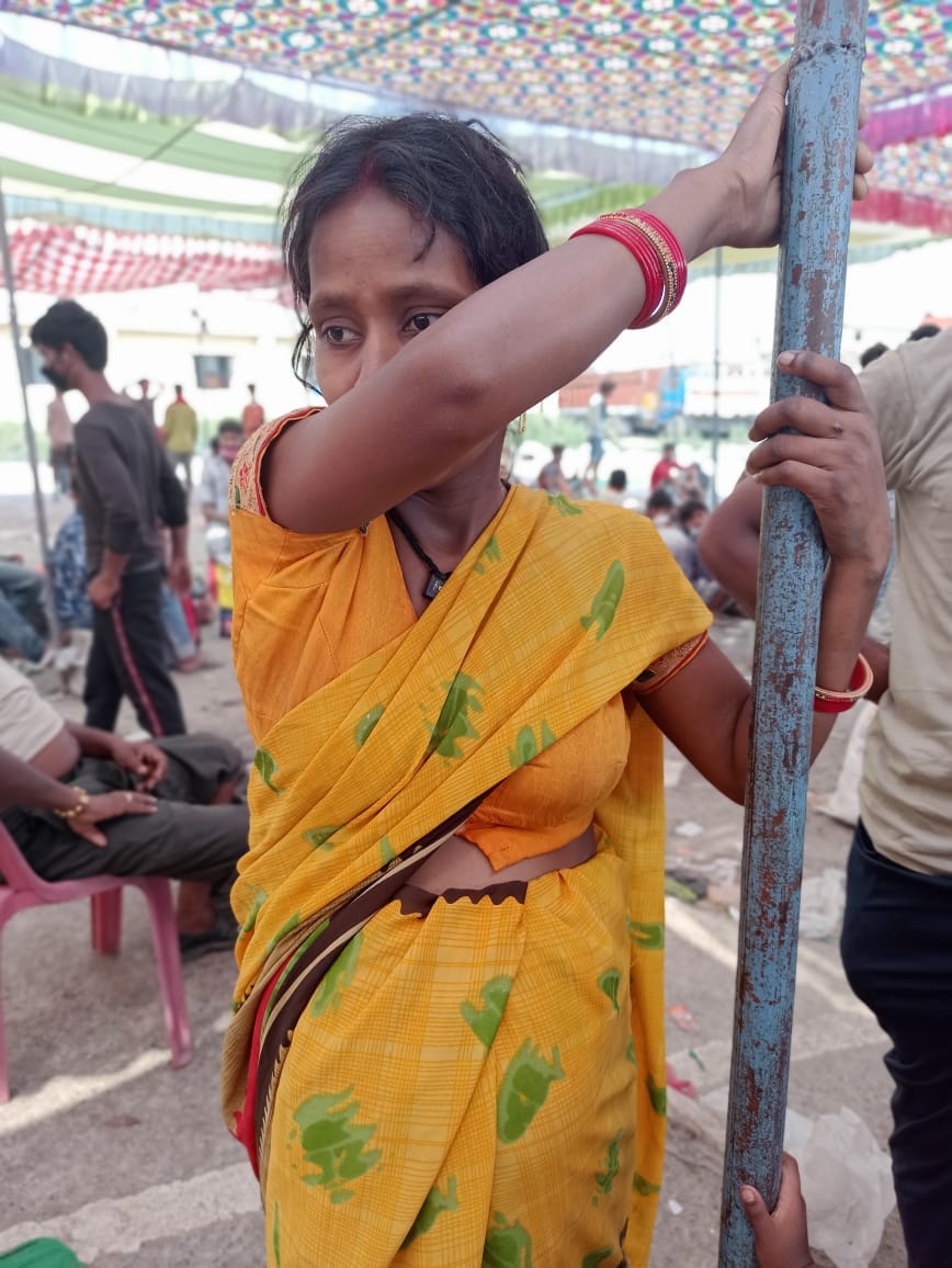 Our driver Manishji spotted Rekha standing at the transit centre in Gopalganj, near the UP-Bihar border, holding onto her stomach and looking like she was silently shrieking in pain.