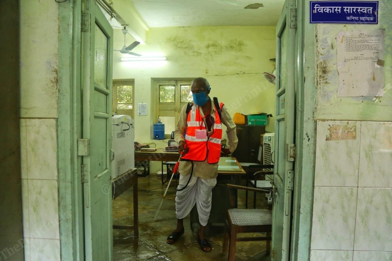 At the Collectorate, we spotted a man wearing a dhoti spraying sodium hypochlorite, a bleaching liquid that kills the virus.