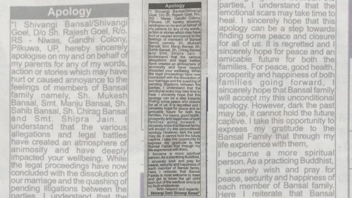 Settling a marital discord case, the top court Tuesday asked IPS officer Shivangi Goel and her parents to tender “an unconditional apology to the husband and his family members”. Upon the court’s directions, the apology was published in the national edition of one renowned English and one Hindi newspaper. The apology was also published and circulated on all social media platforms like Facebook, Instagram, YouTube, etc.