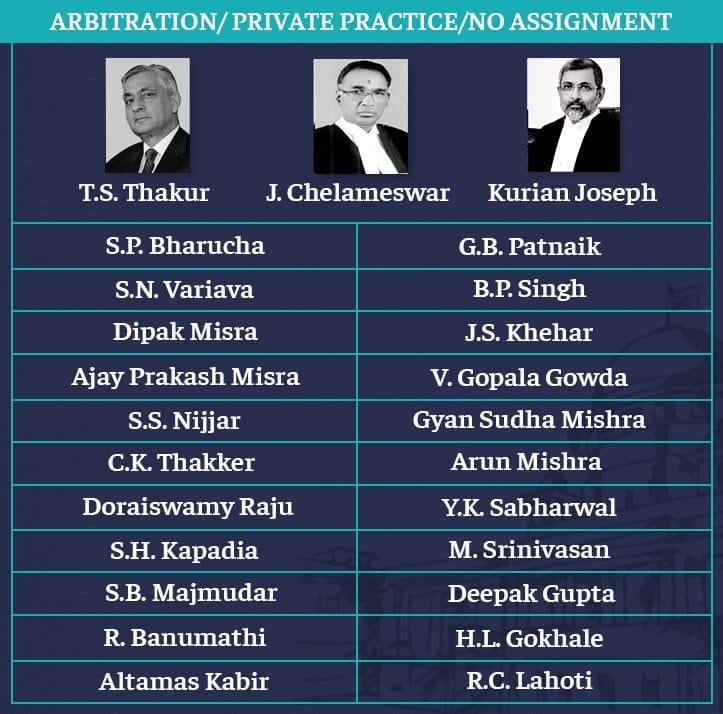 Several judges, meanwhile, have gone on to become arbitrators. These include Justices Ajay Prakash Misra, S.P. Bharucha, G.B. Patnaik, Doraiswamy Raju, S.N. Variava, B.P. Singh, Kurian Joseph, Dipak Misra, J.S. Khehar, T.S. Thakur, V. Gopala Gowda, S.S. Nijjar, Gyan Sudha Mishra, Altamas Kabir and Deepak Verma.