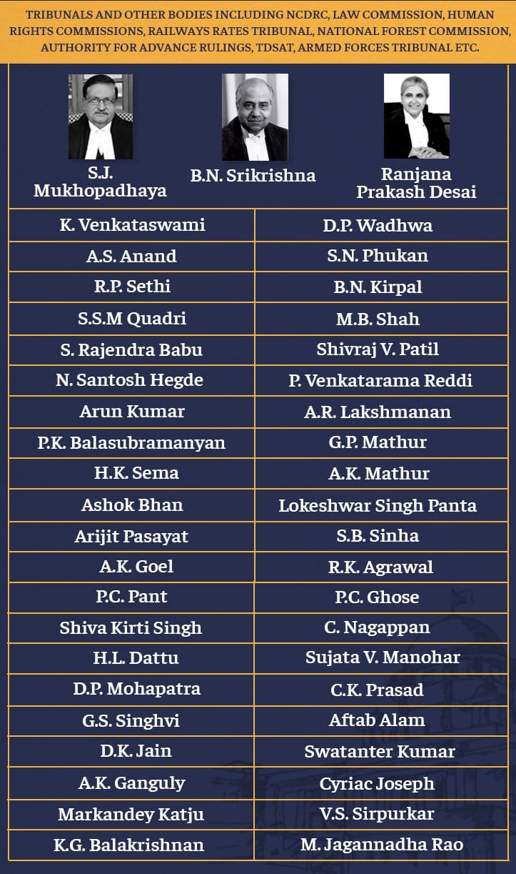 This includes Justices Sujata V. Manohar, P.C. Ghose, Cyriac Joseph, A.S. Anand, S. Rajendra Babu, K.G. Balakrishnan, G.P. Mathur, Shivraj V. Patil, H.L. Dattu and P.C. Pant.