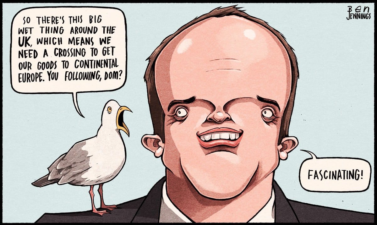 Ben Jennings has a funny take on Brexit secretary Dominic Raab’s admission that he had not understood the United Kingdom’s trade reliance on the Dover-Calais ferry route which connects England with France. The bird, in the cartoon, explains the importance of the English channel crossing to Raab.