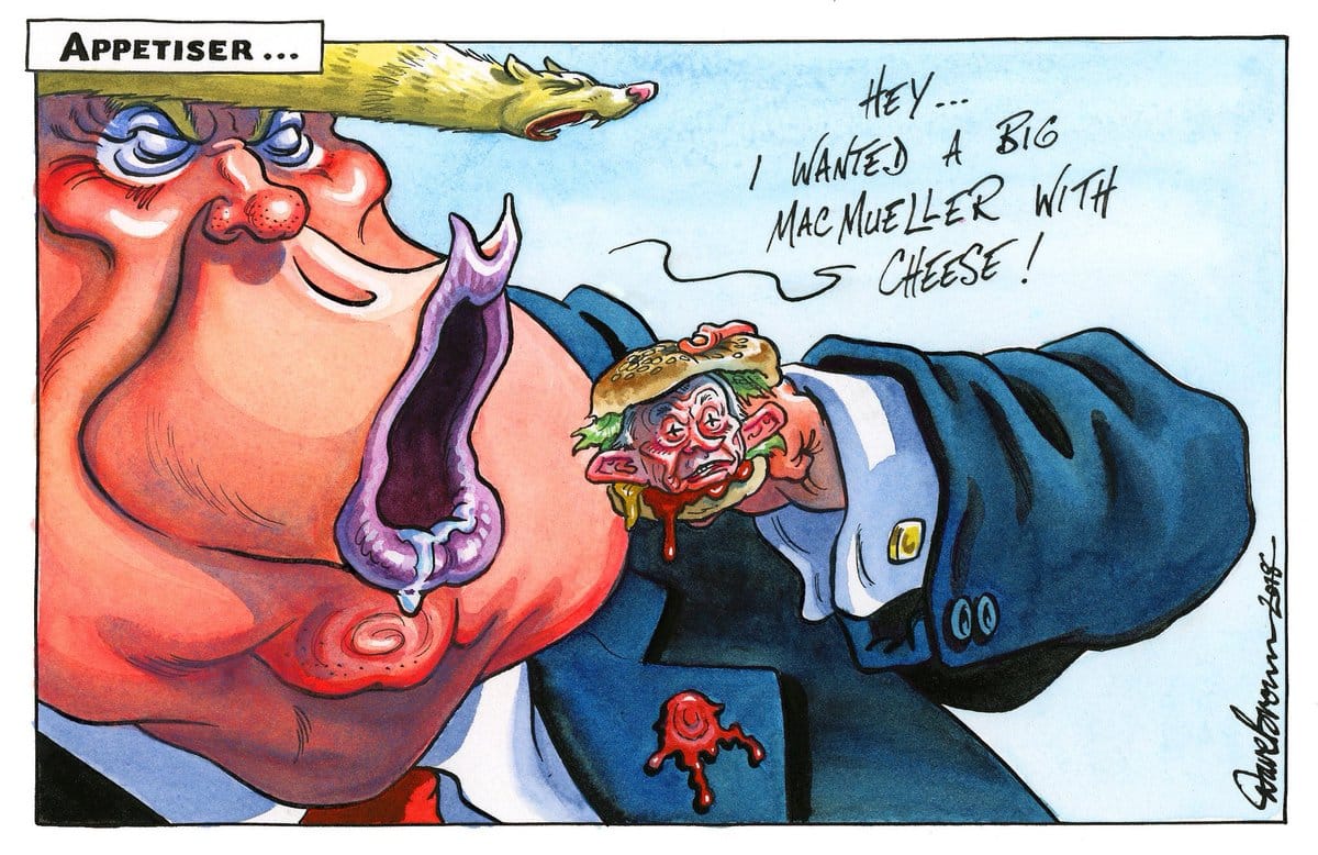 The cartoonist depicts Trump devouring Sessions, and complaining that he wanted a ‘Big MacMueller’ (referring to the famous McDonalds burger). The reference is to Robert Mueller, the former FBI director, who is leading the investigation into alleged Russian interference in the 2016 US elections.
