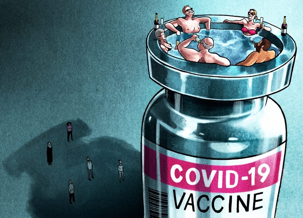 Illustrating for an article by former UK Prime Minister Gordon Brown in The Guardian, Ben Jennings depicts that the Western countries are bathing in surplus Covid vaccines as poor nations look on.
