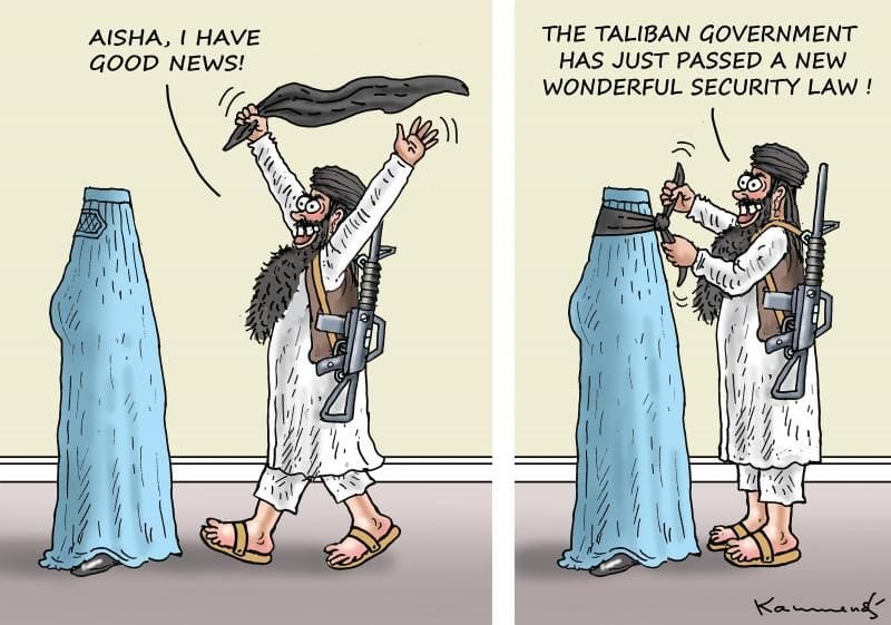 Cartoonist Marian Kamensky draws on women’s rights in Afghanistan under the Taliban rule.