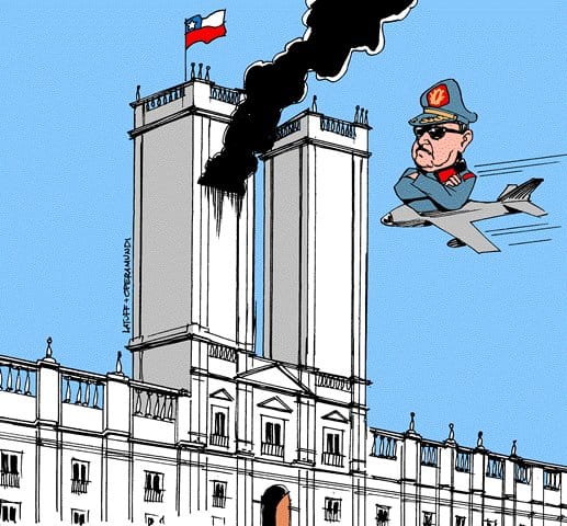 Did you know the first ‘9/11′ attack was a military coup against a democratically elected government in Chile, allegedly backed by the United States in the year 1973? In the attack, the presidential palace was bombed. In this cartoon, Brazilian cartoonist Carlos Latuff brings the readers’ attention to this forgotten 9/11.