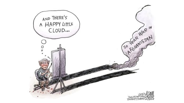 In today’s featured cartoon, Adam Zyglis draws up the shadow of the World Trade Centre’s twin towers, 20 years after 9/11 terrorist attack. In the shadow, smoke can still be seen emanating from the towers, in the form of the 20-year-long war in Afghanistan. And the artist is former US President George Bush under whose presidency America carried out the ‘war on terror’.