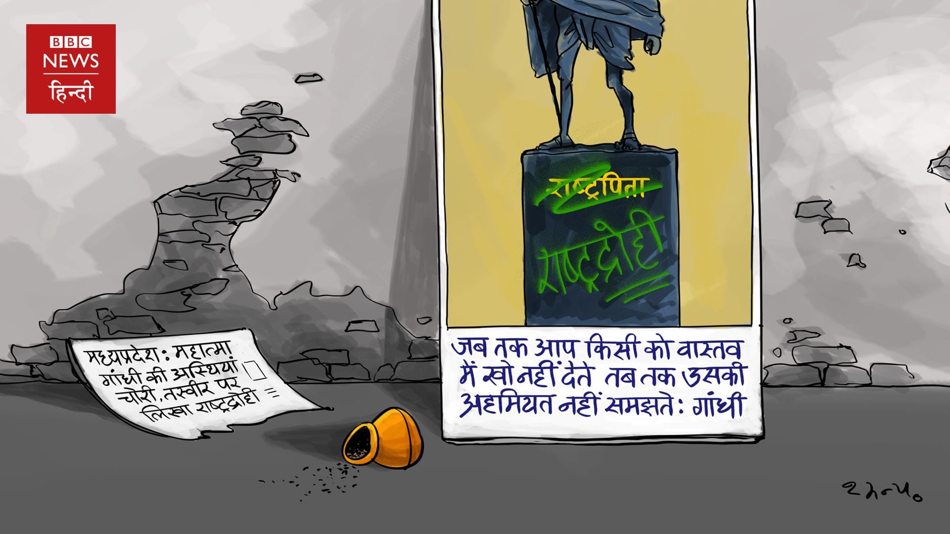 On Gandhi Jayanti, unidentified people stole the mortal remains of Mahatma Gandhi from Bapu Bhawan at Rewa in Madhya Pradesh. The miscreants also vandalised a photograph of Gandhi, scribbling ‘anti-national’ on it. Gopal Shoonya of BBC News Hindi weighs in.