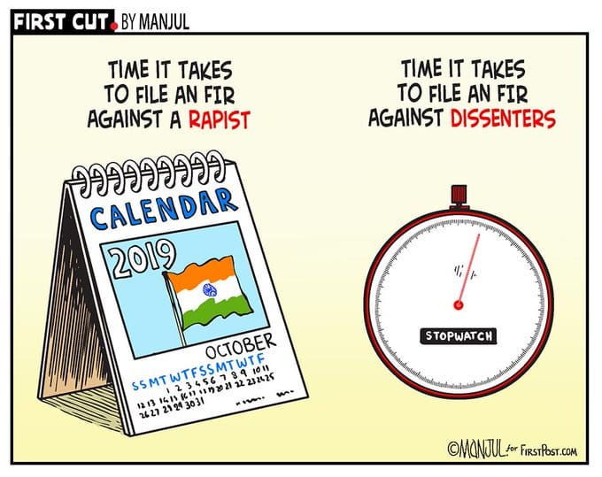 Manjul also offers comment on the sedition case against the 49 celebrities, suggesting that it takes much longer for the Indian legal system to react to crimes such as rape.