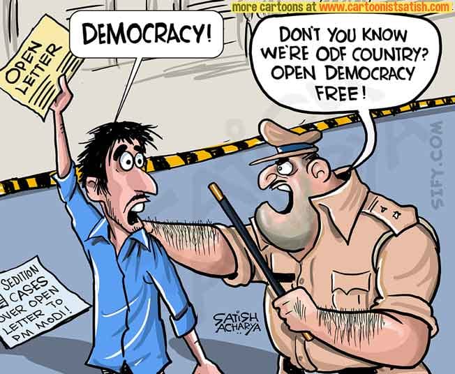 Satish Acharya weighs in on the sedition case filed against 49 celebrities who had written an open letter to PM Modi and expressed concern about growing intolerance in India. The cartoonist also makes a pointed reference to the Modi government’s flagship Swachh Bharat Abhiyan, which aims to make India “ODF” or “open defecation free”.