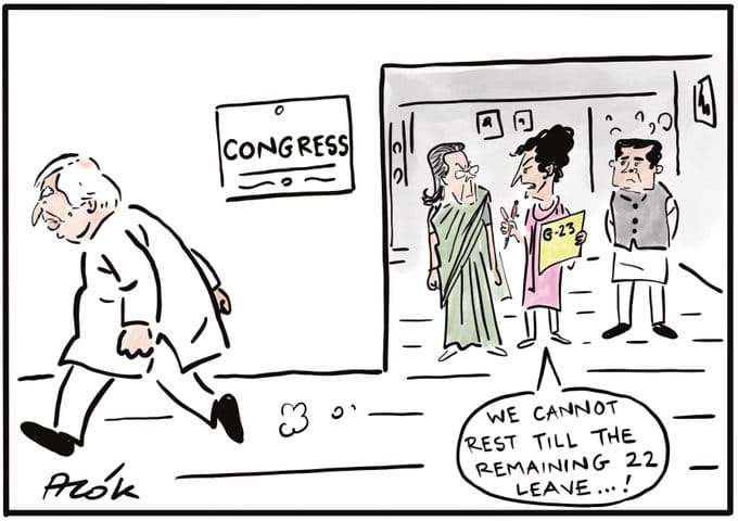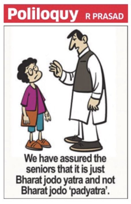 R. Prasad too takes a dig at the exodus of senior leaders from the Congress, while alluding to the party’s call for a 3500-km ‘Bharat Jodo’ yatra. In the cartoon, a Congress leader explains that the party’s senior leaders have been told that it is not a ‘pad yatra’ so they won’t have to travel by foot.