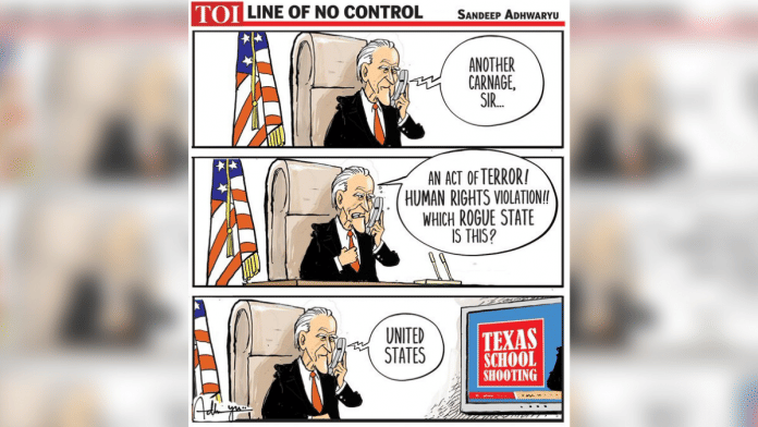 In today’s featured cartoon, Sandeep Adhwaryu comments on America’s failure to take decisive action to curb its gun culture while referring to the shooting at Robb Elementary School in Texas, where an 18-year old gunman opened fire, killing 19 children and two adults Tuesday.
