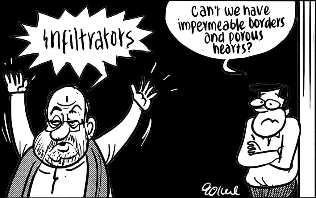 Cartoonist Gokul Gopalakrishnan mocks the government in the context of the recent NRC issue. He asks Amit Shah who is frightened at the sight of infiltrators that “can’t we have borders that are impermeable and hearts that are porous”.