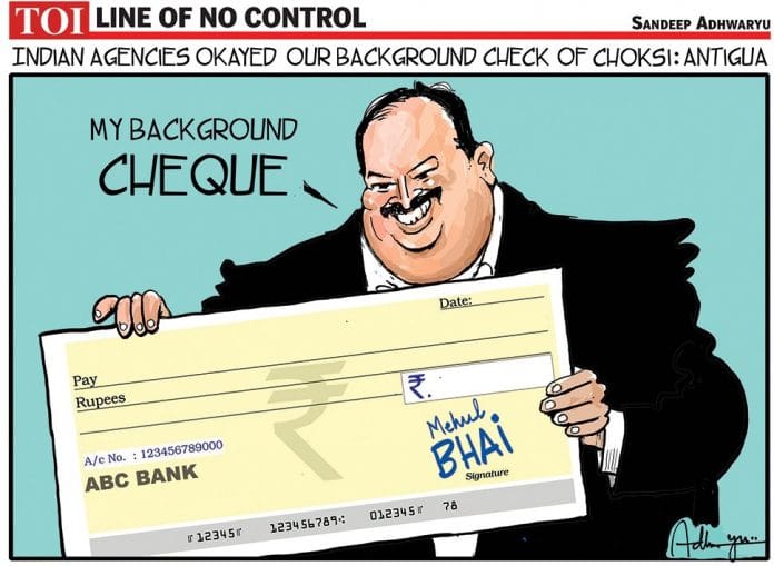 Antiguan agency Citizenship by Investment Unit (CIU) issued a press release saying that the diamond merchant Mehul Choksi’s was granted citizenship after “stringent background checks”. Cartoonist Sandeep Adhwaryu makes a pun out of the word “check” and hilariously illustrates how the fugitive businessman gave “cheques” to get his citizenship granted.