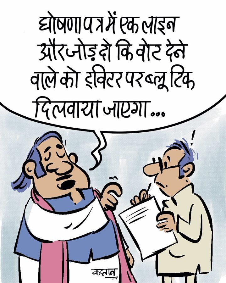With elections in Gujarat drawing closer, Irshad Kaptan pokes fun at innovative campaign strategies adopted by political parties. In the illustration, a politician is instructing his aide: “Add another line in the manifesto, all those who vote (for us) will get a blue tick on Twitter.”