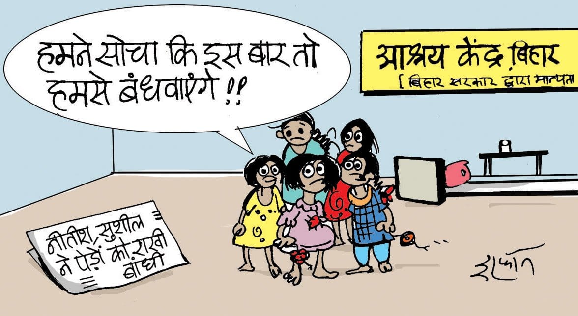 Cartoonist Irfan has a strong take on Bihar chief minister Nitish Kumar’s drive to create awareness about the environment on the occasion of Raksha Bandhan by tying rakhi to trees even as Muzaffarpur shelter home victims await justice.