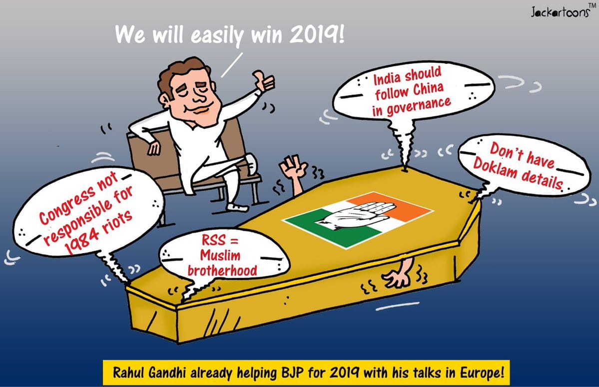 Jackartoons suggests that with all his remarks during the recent Europe tour, Congress chief Rahul Gandhi is assisting BJP ahead of the 2019 elections.