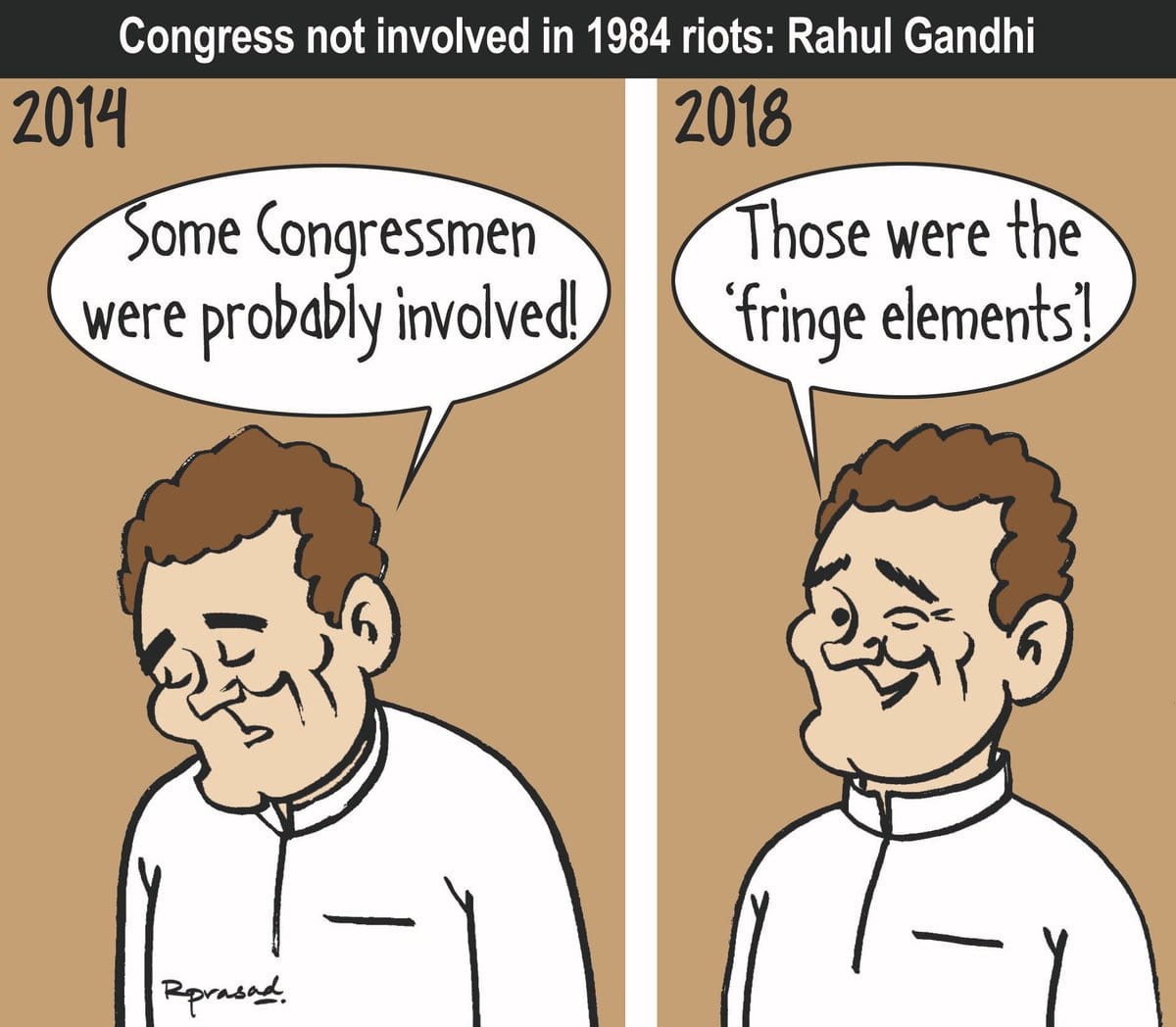 In The Economic Times, R. Prasad pokes fun at Rahul Gandhi’s Saturday remarks where he denied Congress’s involvement in 1984 riots. This was in contrast to Gandhi’s 2014 comments when he had said some of the Congress leaders might have been involved.
