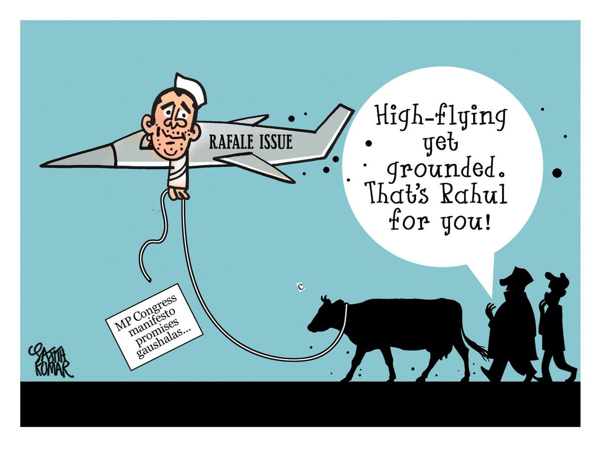 In Deccan Herald, Sajith Kumar offers a funny interpretation of Congress’ brand of politics. He says while Congress president Rahul Gandhi is taking a potshot at the Modi government over the Rafale issue, the party promises gaushalas in poll-bound Madhya Pradesh.