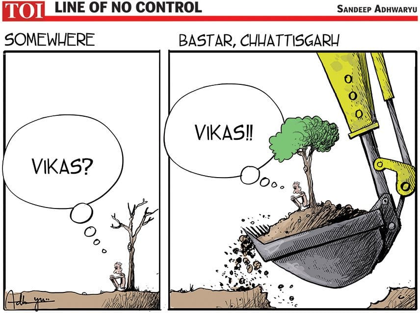 In The Times of India, Sandeep Adhwaryu makes a sarcastic remark on the idea of vikas or development, being propagated by the BJP. In Chhattisgarh, for instance, tribals are being displaced in the name of development.