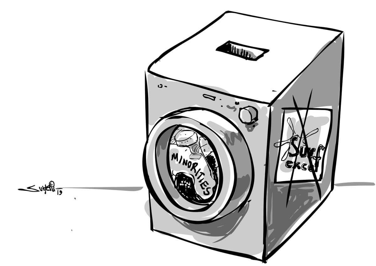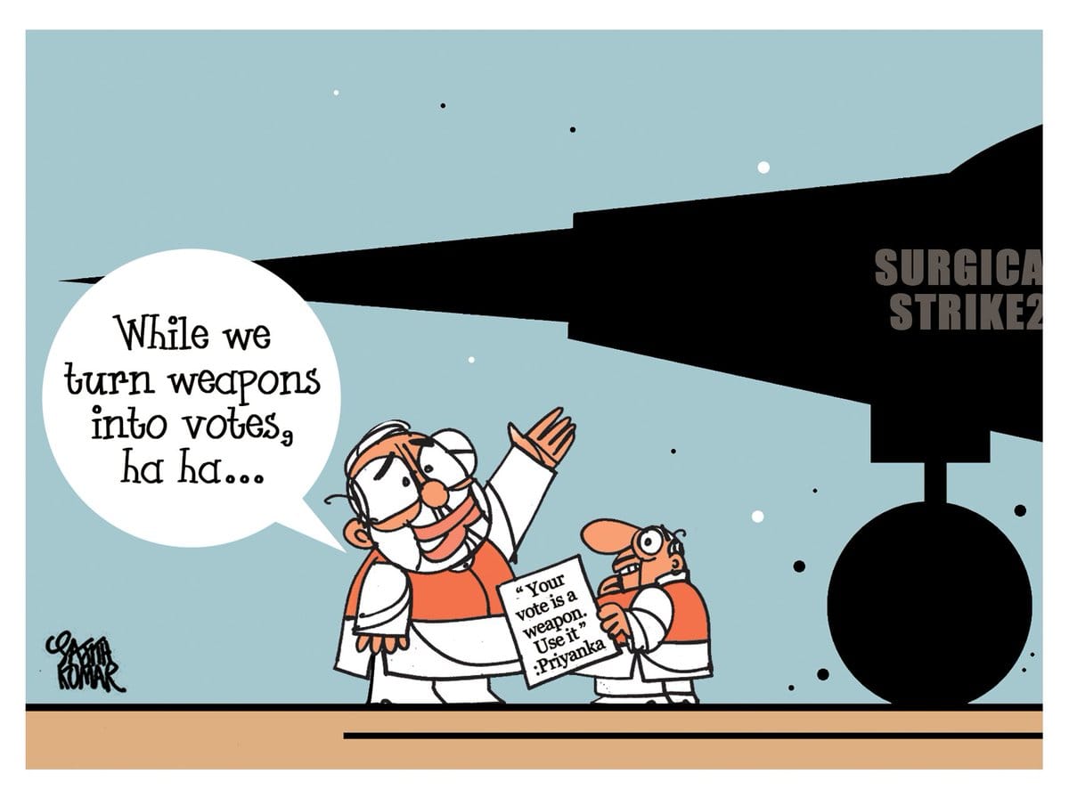 Sajith Kumar for the Deccan Herald takes a potshot at the Modi government for politicising the Balakot air strike. The cartoonist plays with Priyanka Gandhi Vadra’s comment in an election rally in Gujarat where she said that a voter’s vote is a weapon.