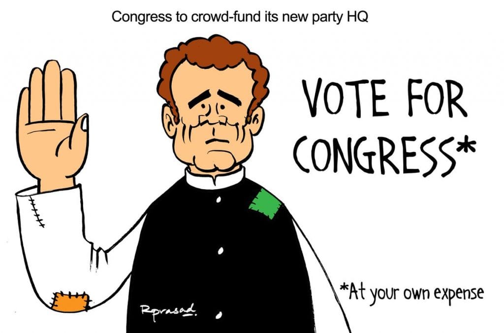 The Congress is planning to crowdfund its new party headquarters in New Delhi. R. Prasad mocks the fact that voting for the Congress now comes with added expenses.