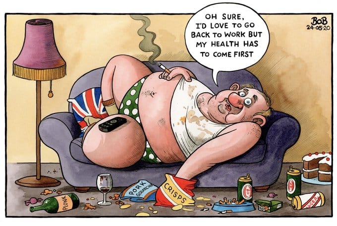 Bob Moran takes a jibe at people who are quite comfortably spending their time away from work at home. A little too comfortably.