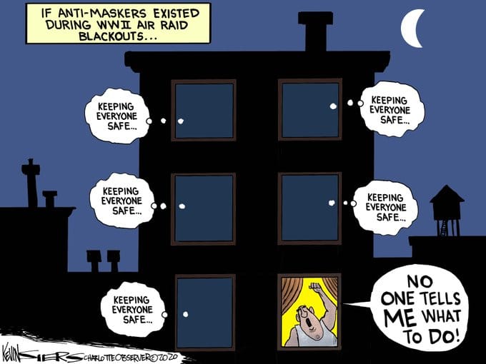 Kevin Siers pokes fun at the anti-lockdown protesters across the world and highlights how dangerous their stance is, by comparing it to the blackouts during World War II. During the war, people in UK and US used to switch off their lights to allow combat ships and planes to sail and fly undetected by enemies.