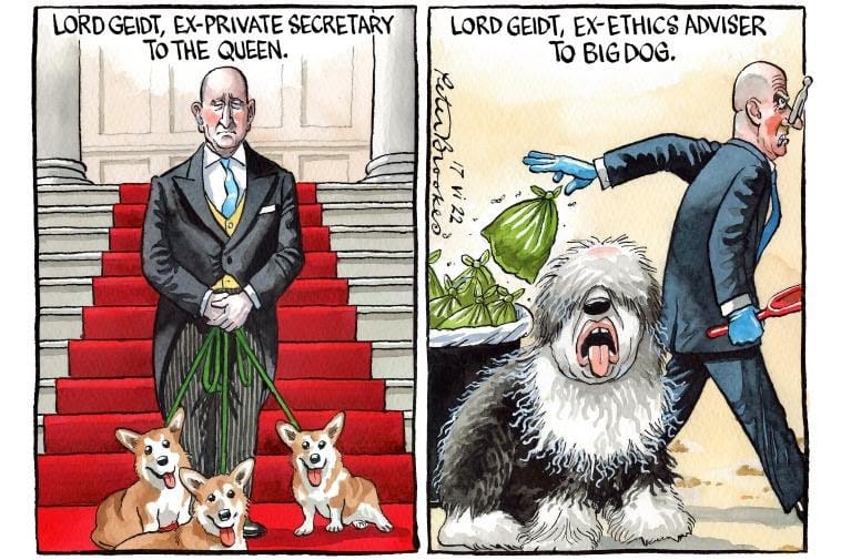 Peter Brookes takes a dig at Lord Geidt’s resignation as Boris Johnson’s ethics adviser on grounds that he was asked to offer advice on a “deliberate and purposeful breach” of the ministerial code, amid reports claiming that Queen Elizabeth used to “keep an eye” on Meghan Markle through him.