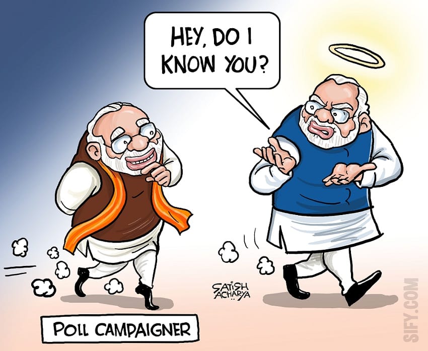 After Prime Minister Narendra Modi’s ‘statesman-like’ speech in the Parliament Saturday, Satish Acharya takes a jibe at the ‘angelic’ PM for his hardline poll campaign.