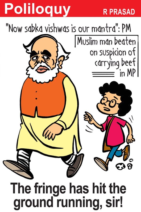 After Prime Minister Narendra Modi’s speech in the Parliament urging his party to gain the trust of minorities, R. Prasad takes a dig at the PM’s statement in light of the recent attack on a Muslim couple and a Hindu man. The cartoonist highlights the party’s ‘fringe’ that has ‘hit the ground running’.