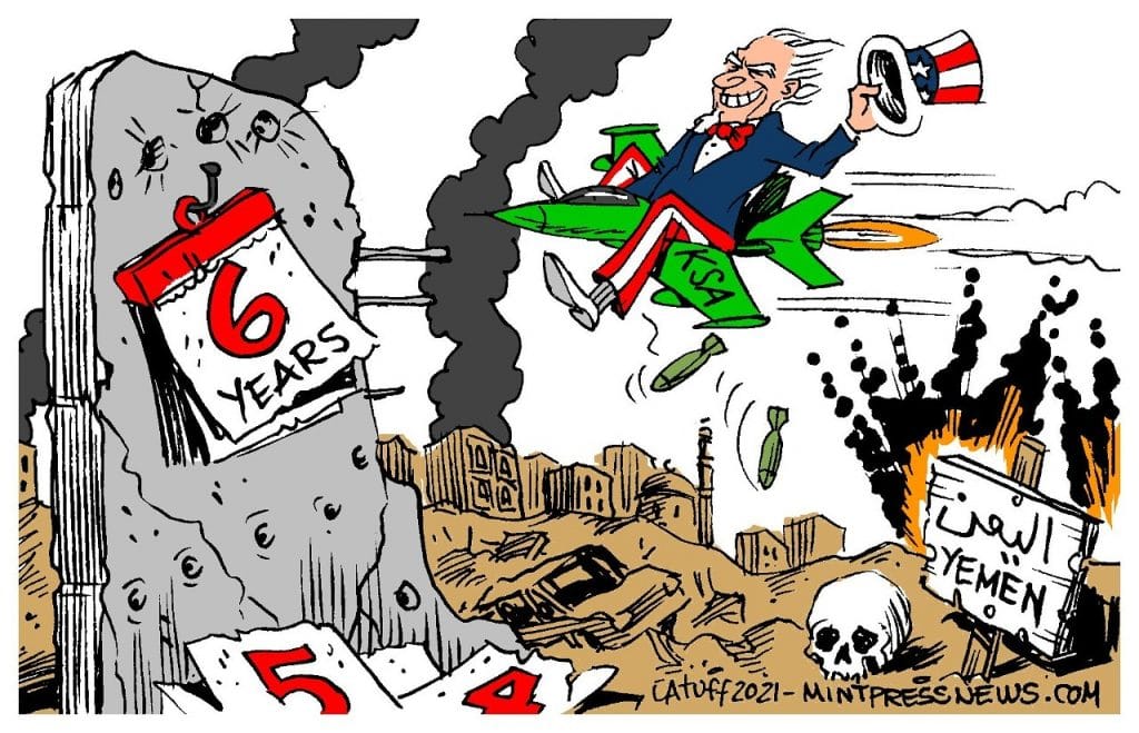 Carlos Latuff comments on the US-backed Saudi Arabia-led war against Houthi rebels in Yemen, which completes six years this week and has precipitated a humanitarian crisis of vast proportions. US President Joe Biden recently said the war in Yemen must stop.