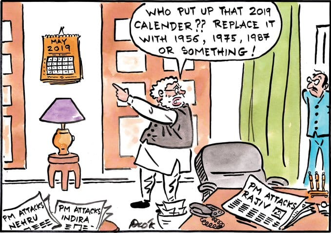 Sajith Kumar, for Deccan Herald, also takes a potshot at Prime Minister Narendra Modi for invoking late Congress PMs – Jawaharlal Nehru, Indira Gandhi and Rajiv Gandhi – in his election speeches.