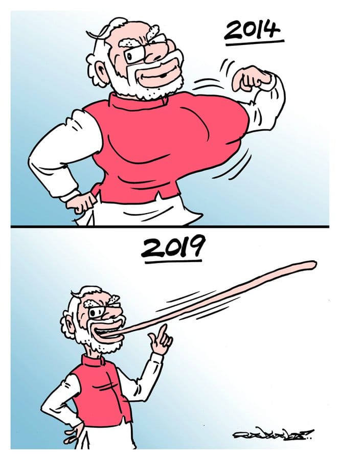 Mahamud illustrates the two sides of Prime Minister Narendra Modi – the one in 2014 election and the other in this election. While in 2014, Modi talked about his ’56-inch’ chest to seek votes, this time his tongue has grown bigger and he is making fiery speeches to get votes.