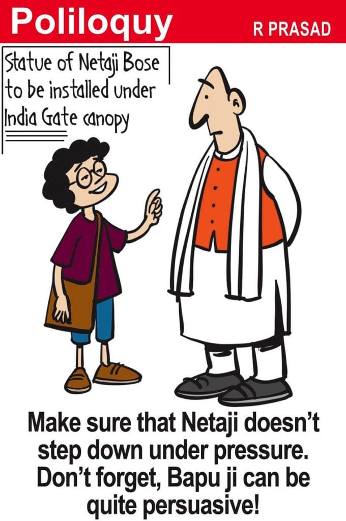 In today’s featured cartoon, Manjul takes a dig at developments over the past 7 1/2 years under the Narendra Modi government as he comments on the decision to install a “grand statue” of Subhas Chandra Bose at India Gate in Delhi. A temporary hologram statue was unveiled on 23 January — the freedom fighter’s 125th birth anniversary — and is to be in place until the final granite work is completed.